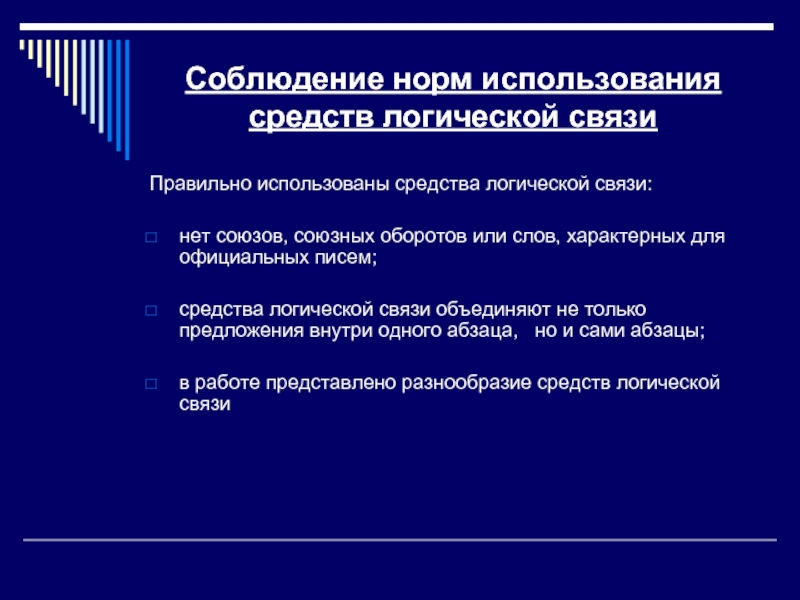 Слайд 33Соблюдение норм использования средств логической связи