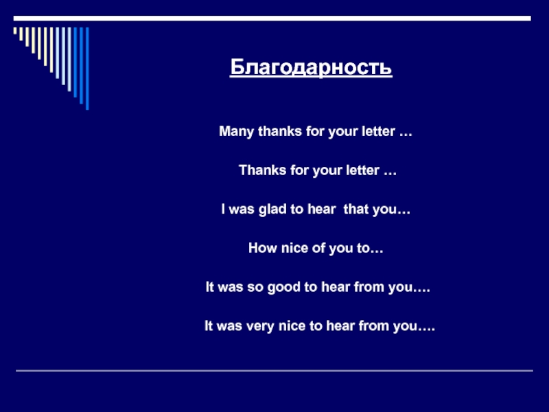Thank you for your letter. I’m happy to receive some news from you. How are you getting on?