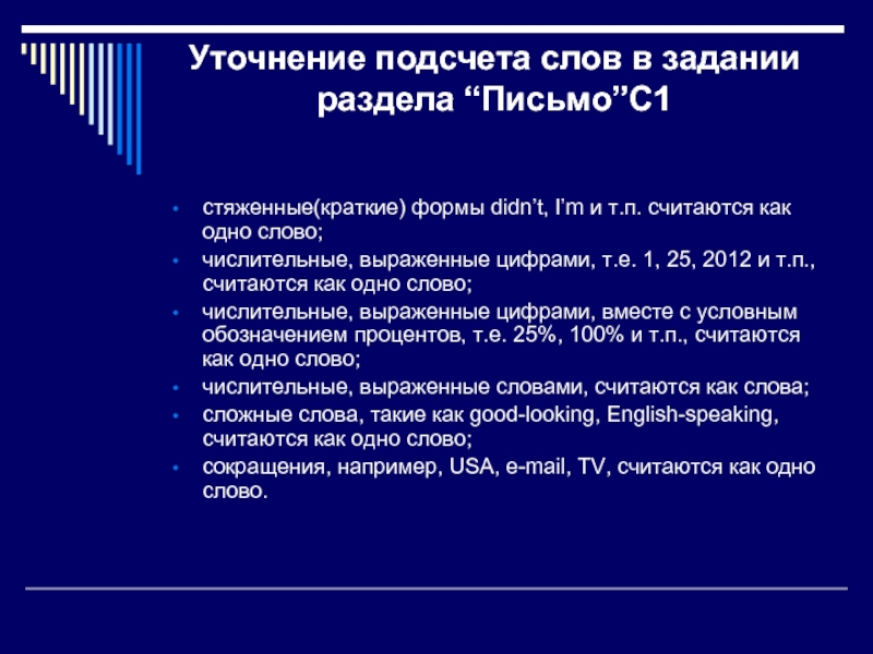 Слайд 9Уточнение подсчета слов в задании раздела “Письмо”С1