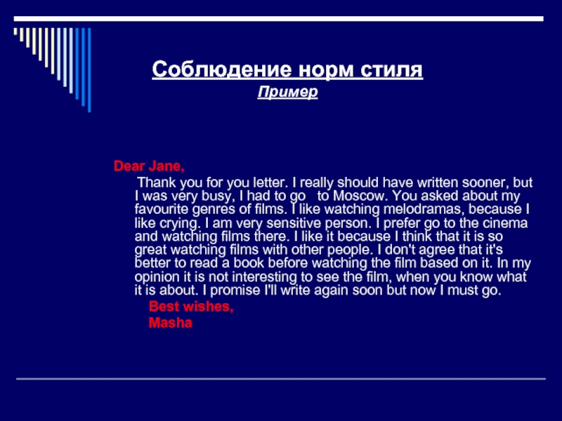 Соблюдение норм оформления текста письма, принятыми в стране изучаемого языка