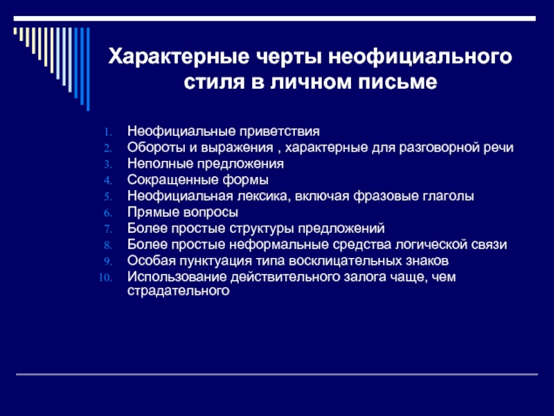 союзов, союзных оборотов или слов, характерных для официальных писем;
