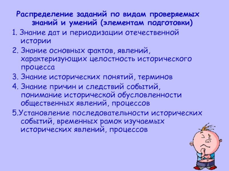 Слайд 8Распределение заданий по видам проверяемых знаний и умений (элементам подготовки)