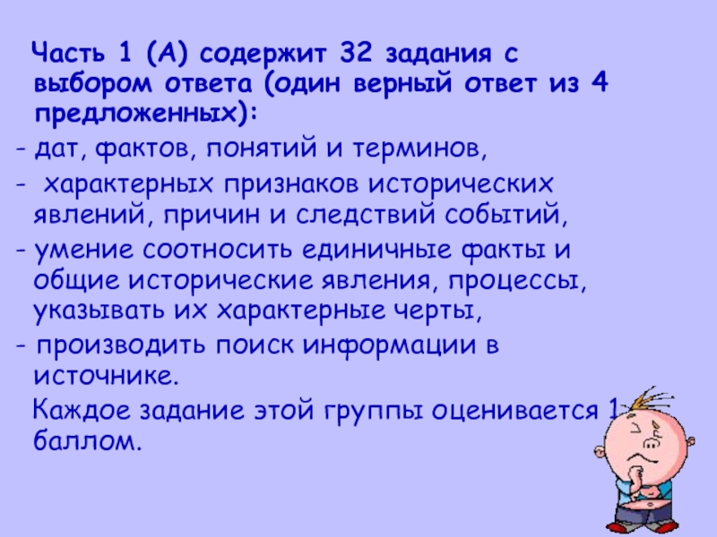 Слайд 11 Часть 1 (А) содержит 32 задания с выбором ответа