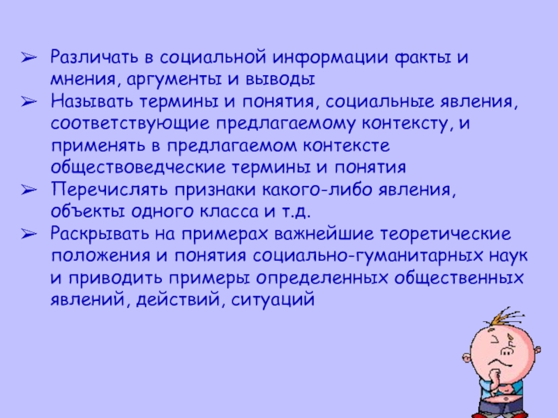 Слайд 52 Распознавать признаки понятий, характерные черты социального объекта, элементы его описания;