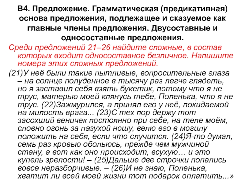 Слайд 24В4. Предложение. Грамматическая (предикативная) основа предложения, подлежащее и сказуемое как главные