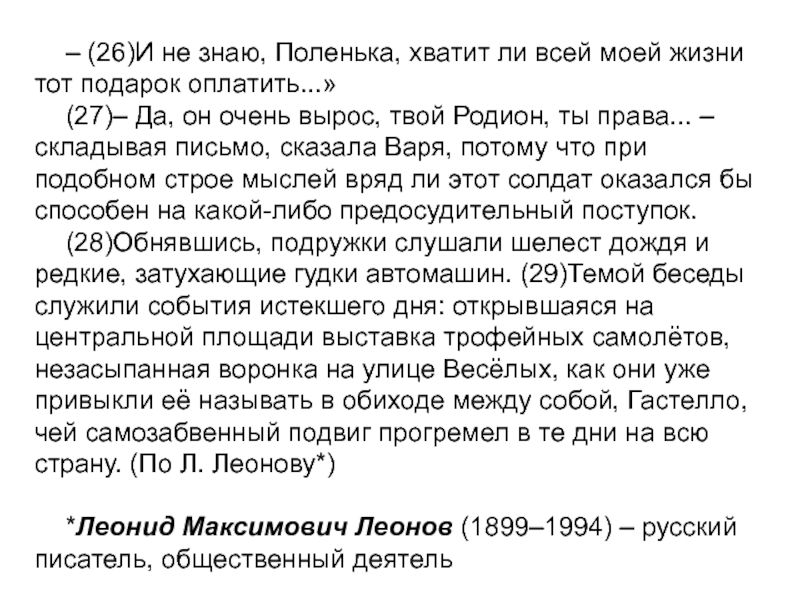 (28)Обнявшись, подружки слушали шелест дождя и редкие, затухающие гудки автомашин. (29)Темой беседы служили события истекшего дня: открывшаяся на центральной площади выставка трофейных самолётов, незасыпанная воронка на улице Весёлых, как они уже привыкли её называть в обиходе между собой, Гастелло, чей самозабвенный подвиг прогремел в те дни на всю страну. (По Л. Леонову*)