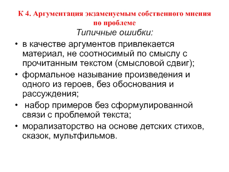 Слайд 59К 4. Аргументация экзаменуемым собственного мнения по проблеме