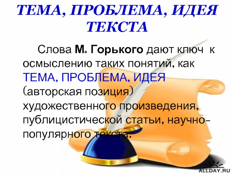 Слайд 6ТЕМА, ПРОБЛЕМА, ИДЕЯ ТЕКСТА