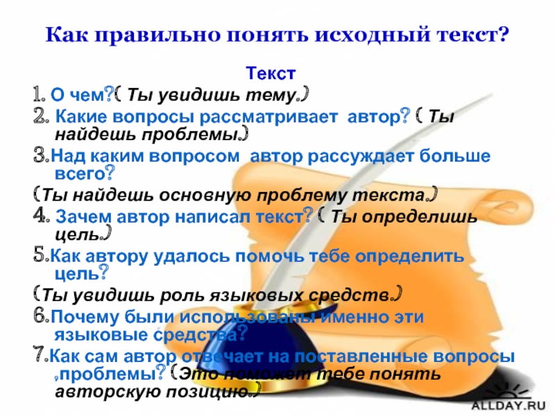 2. Задайте этот вопрос ко всему тексту. Если текст отвечает на этот вопрос – вы нашли проблему, поднятую автором в тексте. Прокомментируйте её, объясните, зачем она.