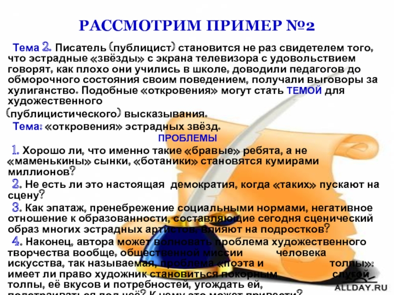 понятий, как ТЕМА, ПРОБЛЕМА, ИДЕЯ (авторская позиция) художественного произведения, публицистической статьи, научно-популярного текста.