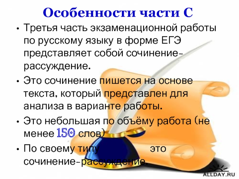 выразить своё собственное мнение. Субъективный взгляд может быть сколь угодно спорным, но он должен базироваться на понимании проблем текста. Хорошо запомните! Объем сочинения – 150-300 слов. Оптимально 150 + 20 слов, но не менее 150!!!
