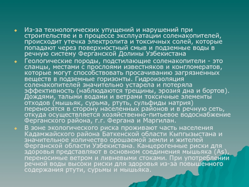 соленакопителей, происходит утечка электролита и токсичных солей, которые попадают через поверхностный смыв и подземные воды в речную систему Ферганской Долины Узбекистана