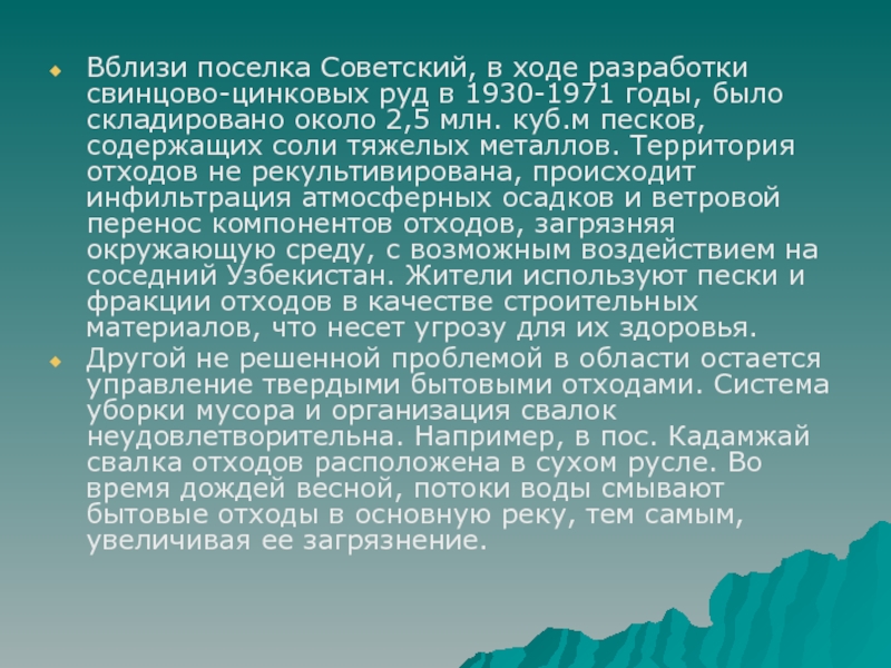 было складировано около 2,5 млн. куб.м песков, содержащих соли тяжелых металлов. Территория отходов не рекультивирована, происходит инфильтрация атмосферных осадков и ветровой перенос компонентов отходов, загрязняя окружающую среду, с возможным воздействием на соседний Узбекистан. Жители используют пески и фракции отходов в качестве строительных материалов, что несет угрозу для их здоровья.