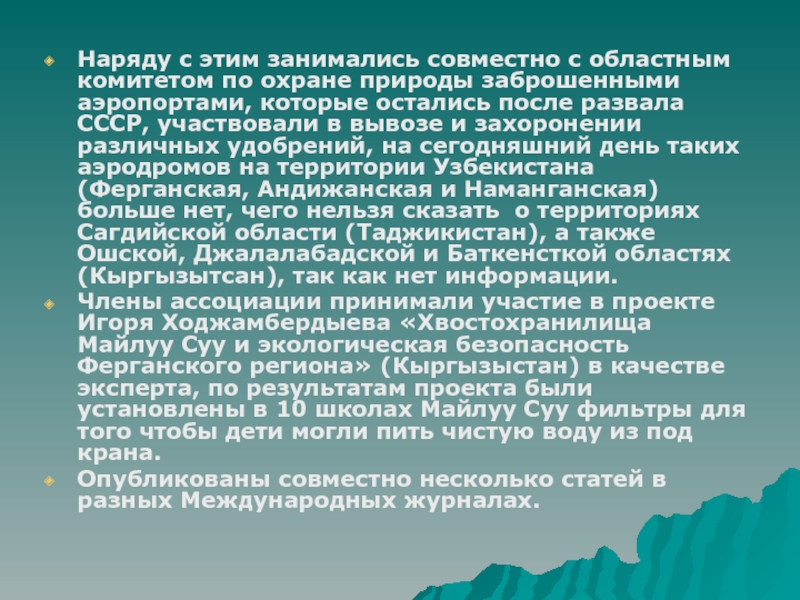 Члены ассоциации принимали участие в проекте Игоря Ходжамбердыева «Хвостохранилища Майлуу Суу и экологическая безопасность Ферганского региона» (Кыргызыстан) в качестве эксперта, по результатам проекта были установлены в 10 школах Майлуу Суу фильтры для того чтобы дети могли пить чистую воду из под крана.