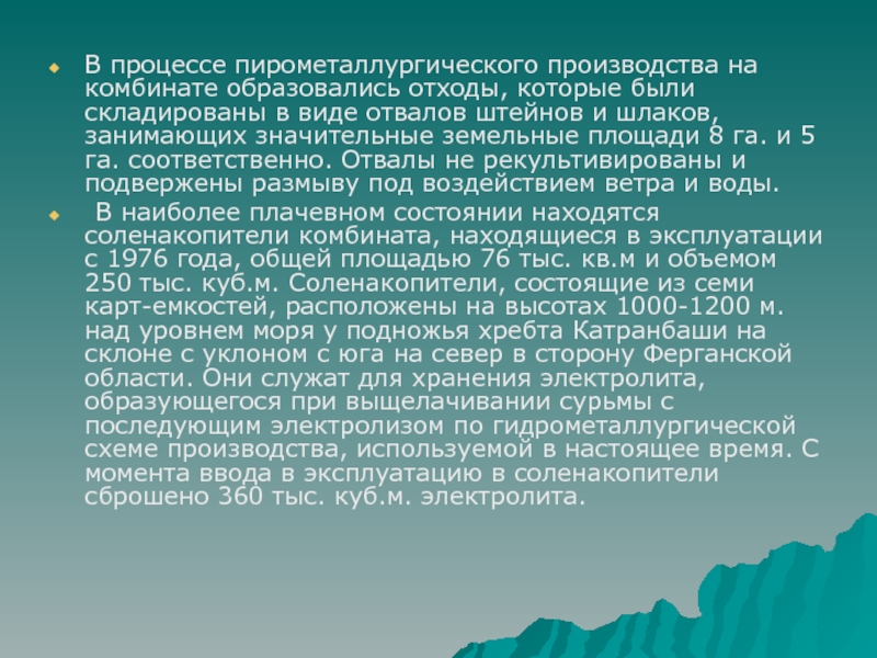 В наиболее плачевном состоянии находятся соленакопители комбината, находящиеся в эксплуатации с 1976 года, общей площадью 76 тыс. кв.м и объемом 250 тыс. куб.м. Соленакопители, состоящие из семи карт-емкостей, расположены на высотах 1000-1200 м. над уровнем моря у подножья хребта Катранбаши на склоне с уклоном с юга на север в сторону Ферганской области. Они служат для хранения электролита, образующегося при выщелачивании сурьмы с последующим электролизом по гидрометаллургической схеме производства, используемой в настоящее время. С момента ввода в эксплуатацию в соленакопители сброшено 360 тыс. куб.м. электролита.