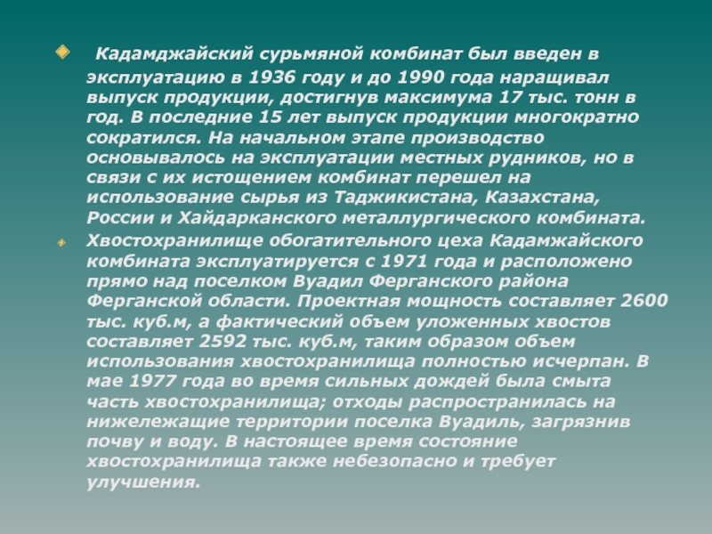 Слайд 10 Кадамджайский сурьмяной комбинат был введен в эксплуатацию в 1936 году и