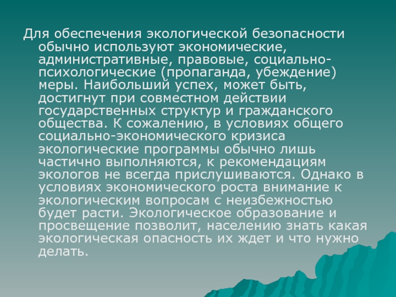 Слайд 23Для обеспечения экологической безопасности обычно используют экономические, административные, правовые, социально-психологические (пропаганда,