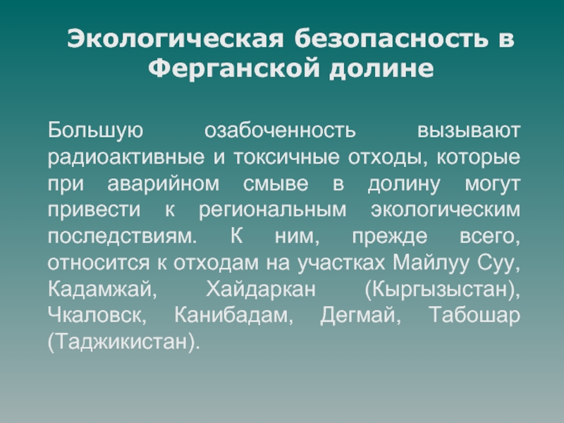 которые при аварийном смыве в долину могут привести к региональным экологическим последствиям. К ним, прежде всего, относится к отходам на участках Майлуу Суу, Кадамжай, Хайдаркан (Кыргызыстан), Чкаловск, Канибадам, Дегмай, Табошар (Таджикистан).