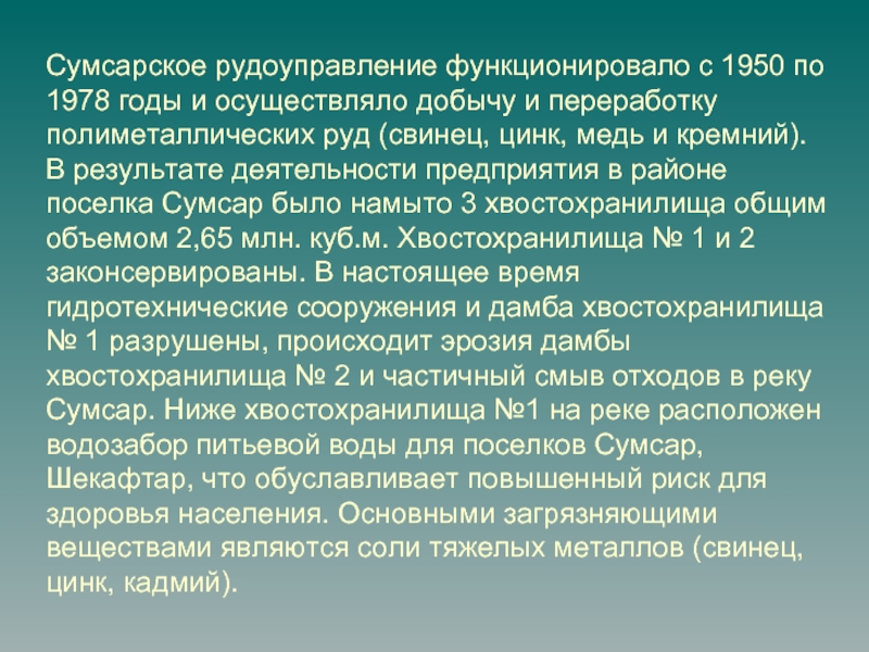 и переработку полиметаллических руд (свинец, цинк, медь и кремний). В результате деятельности предприятия в районе поселка Сумсар было намыто 3 хвостохранилища общим объемом 2,65 млн. куб.м. Хвостохранилища № 1 и 2 законсервированы. В настоящее время гидротехнические сооружения и дамба хвостохранилища № 1 разрушены, происходит эрозия дамбы хвостохранилища № 2 и частичный смыв отходов в реку Сумсар. Ниже хвостохранилища №1 на реке расположен водозабор питьевой воды для поселков Сумсар, Шекафтар, что обуславливает повышенный риск для здоровья населения. Основными загрязняющими веществами являются соли тяжелых металлов (свинец, цинк, кадмий).