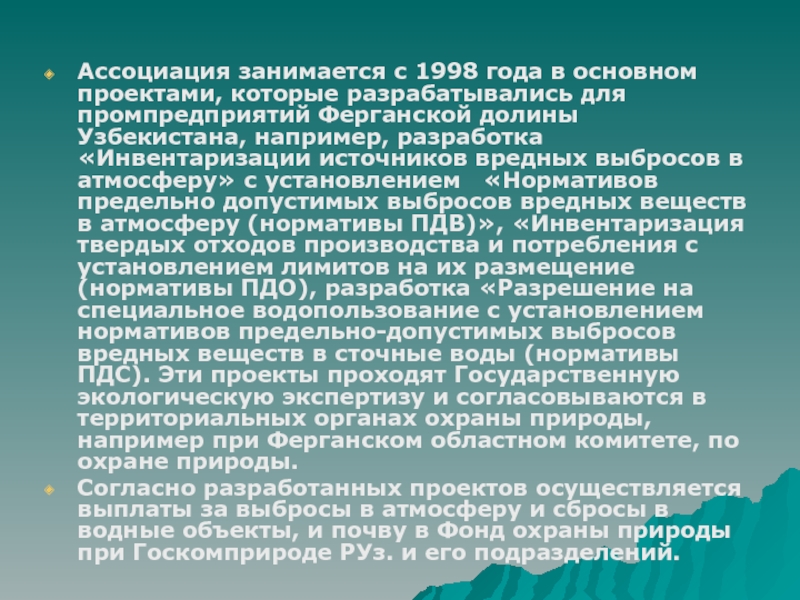 промпредприятий Ферганской долины Узбекистана, например, разработка «Инвентаризации источников вредных выбросов в атмосферу» с установлением «Нормативов предельно допустимых выбросов вредных веществ в атмосферу (нормативы ПДВ)», «Инвентаризация твердых отходов производства и потребления с установлением лимитов на их размещение (нормативы ПДО), разработка «Разрешение на специальное водопользование с установлением нормативов предельно-допустимых выбросов вредных веществ в сточные воды (нормативы ПДС). Эти проекты проходят Государственную экологическую экспертизу и согласовываются в территориальных органах охраны природы, например при Ферганском областном комитете, по охране природы.