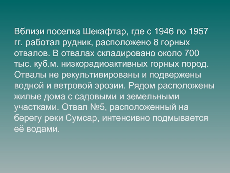 гг. работал рудник, расположено 8 горных отвалов. В отвалах складировано около 700 тыс. куб.м. низкорадиоактивных горных пород. Отвалы не рекультивированы и подвержены водной и ветровой эрозии. Рядом расположены жилые дома с садовыми и земельными участками. Отвал №5, расположенный на берегу реки Сумсар, интенсивно подмывается её водами.