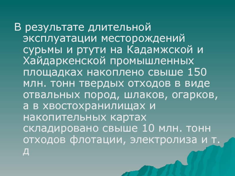 Слайд 15В результате длительной эксплуатации месторождений сурьмы и ртути на Кадамжской и