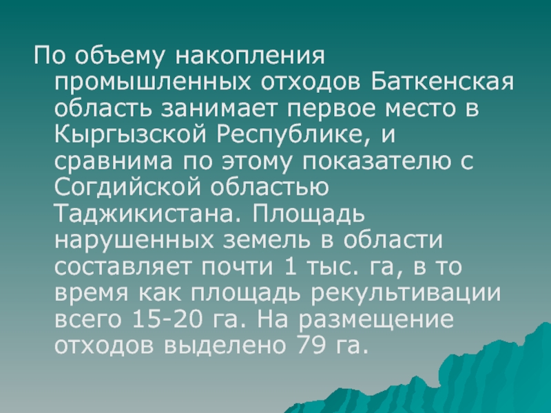 Кыргызской Республике, и сравнима по этому показателю с Согдийской областью Таджикистана. Площадь нарушенных земель в области составляет почти 1 тыс. га, в то время как площадь рекультивации всего 15-20 га. На размещение отходов выделено 79 га.