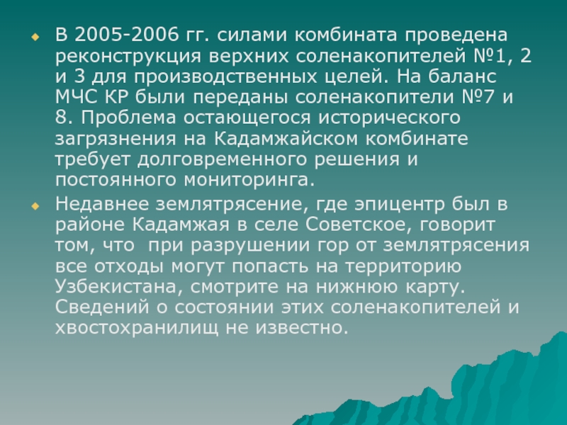и 3 для производственных целей. На баланс МЧС КР были переданы соленакопители №7 и 8. Проблема остающегося исторического загрязнения на Кадамжайском комбинате требует долговременного решения и постоянного мониторинга.