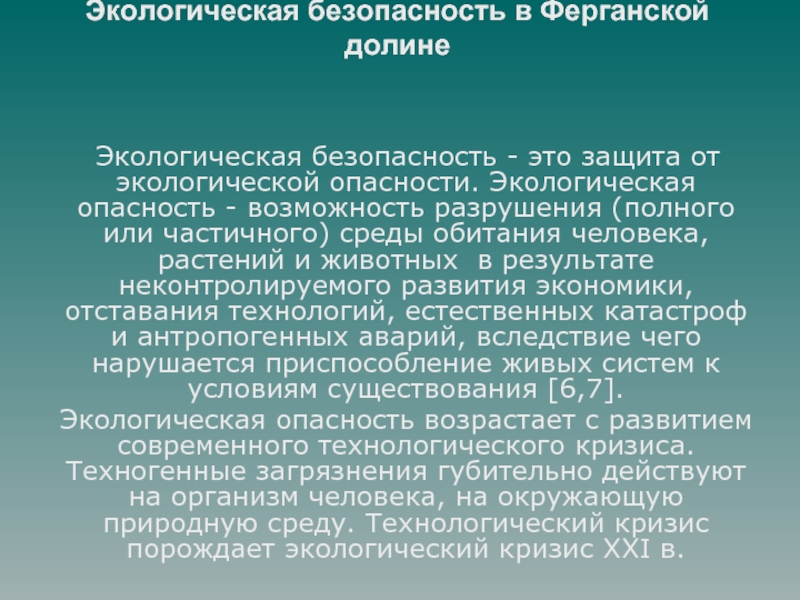 Экологическая опасность возрастает с развитием современного технологического кризиса. Техногенные загрязнения губительно действуют на организм человека, на окружающую природную среду. Технологический кризис порождает экологический кризис XХI в.