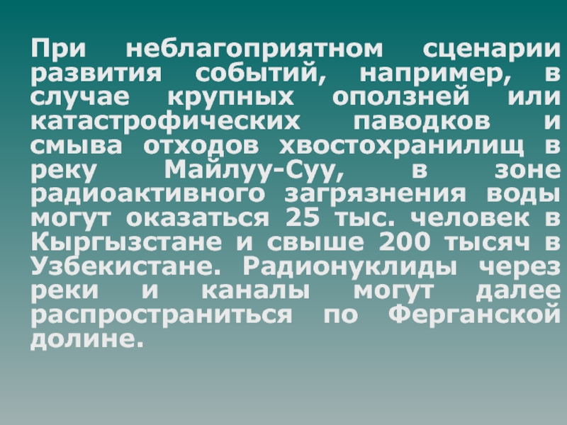 катастрофических паводков и смыва отходов хвостохранилищ в реку Майлуу-Суу, в зоне радиоактивного загрязнения воды могут оказаться 25 тыс. человек в Кыргызстане и свыше 200 тысяч в Узбекистане. Радионуклиды через реки и каналы могут далее распространиться по Ферганской долине.