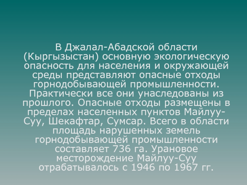 среды представляют опасные отходы горнодобывающей промышленности. Практически все они унаследованы из прошлого. Опасные отходы размещены в пределах населенных пунктов Майлуу-Суу, Шекафтар, Сумсар. Всего в области площадь нарушенных земель горнодобывающей промышленности составляет 736 га. Урановое месторождение Майлуу-Суу отрабатывалось с 1946 по 1967 гг.