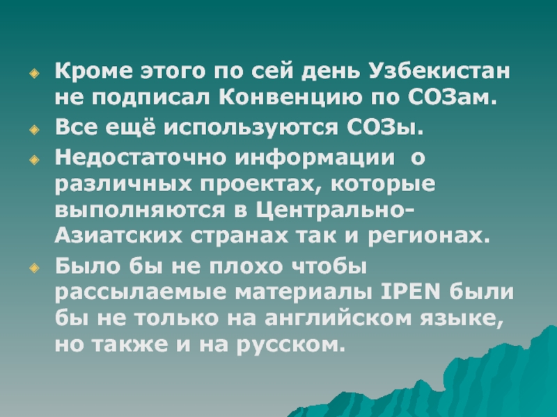 Слайд 24Кроме этого по сей день Узбекистан не подписал Конвенцию по СОЗам.