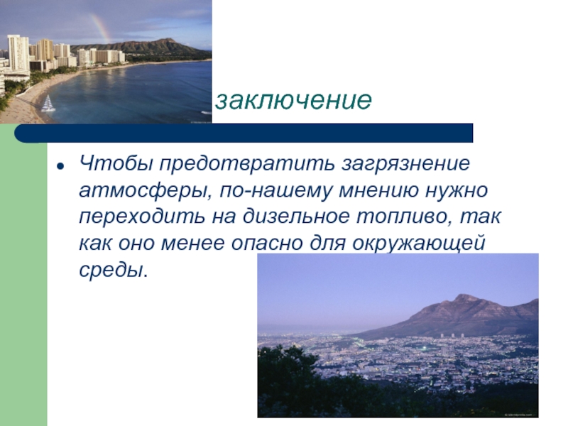 Чтобы предотвратить загрязнение атмосферы, по-нашему мнению нужно переходить на дизельное топливо,