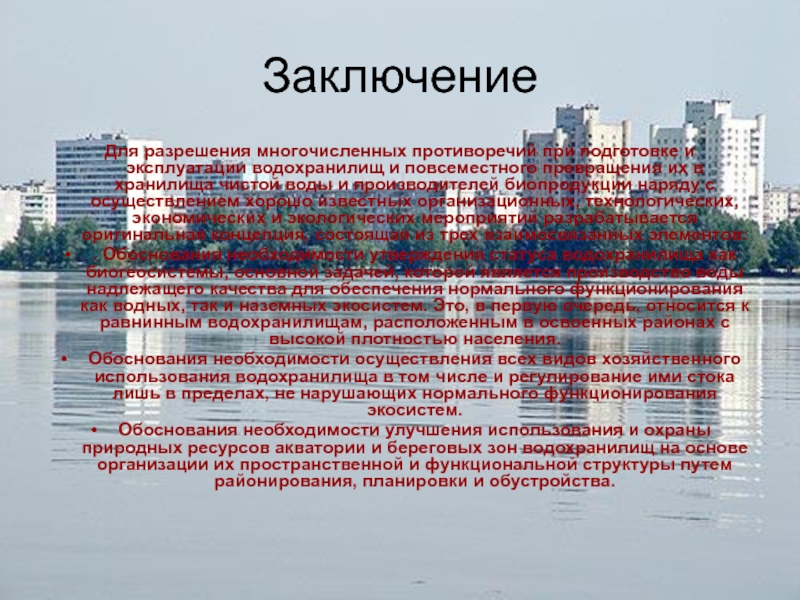 . Обоснования необходимости утверждения статуса водохранилища как биогеосистемы, основной задачей, которой является производство воды надлежащего качества для обеспечения нормального функционирования как водных, так и наземных экосистем. Это, в первую очередь, относится к равнинным водохранилищам, расположенным в освоенных районах с высокой плотностью населения.