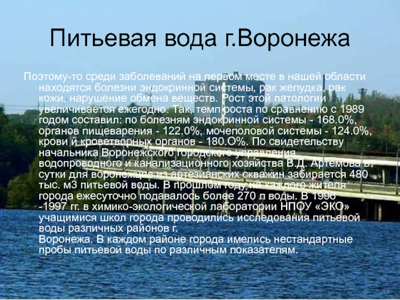 находятся болезни эндокринной системы, рак желудка, рак кожи, нарушение обмена веществ. Рост этой патологии увеличивается ежегодно. Так, темп роста по сравнению с 1989 годом составил: по болезням эндокринной системы - 168.0%, органов пищеварения - 122.0%, мочеполовой системы - 124.0%, крови и кроветворных органов - 180.О%. По свидетельству начальника Воронежского городского управления водопроводного и канализационного хозяйства В.Д. Артемова в сутки для воронежцев из артезианских скважин забирается 480 тыс. м3 питьевой воды. В прошлом году на каждого жителя города ежесуточно подавалось более 270 л воды. В 1996