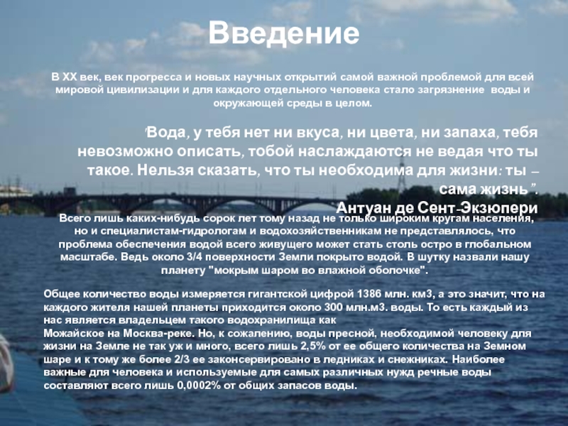 Можайское на Москва-реке. Но, к сожалению, воды пресной, необходимой человеку для жизни на Земле не так уж и много, всего лишь 2,5% от ее общего количества на Земном шаре и к тому же более 2/3 ее законсервировано в ледниках и снежниках. Наиболее важные для человека и используемые для самых различных нужд речные воды составляют всего лишь 0,0002% от общих запасов воды.