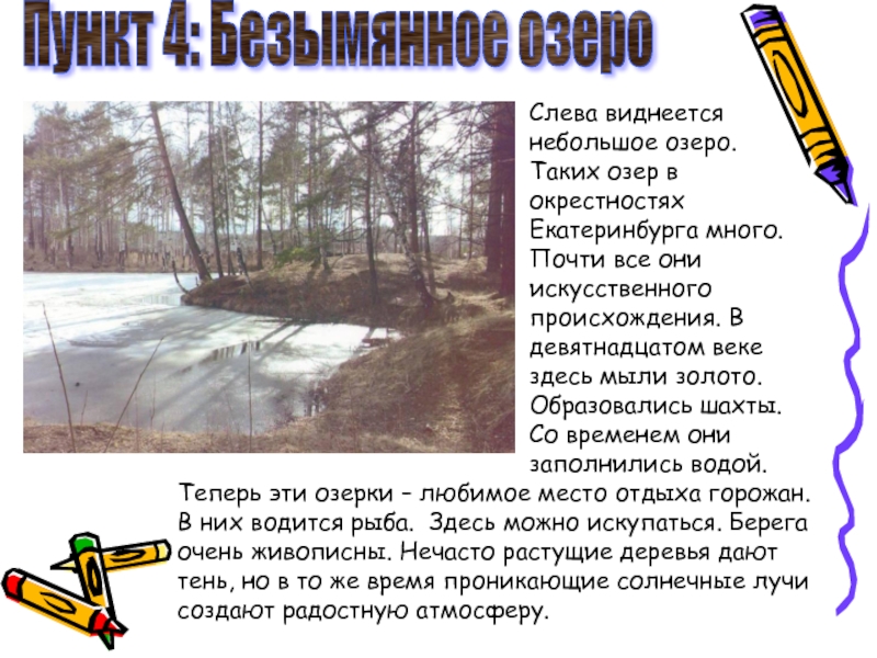 Теперь эти озерки – любимое место отдыха горожан. В них водится рыба. Здесь можно искупаться. Берега очень живописны. Нечасто растущие деревья дают тень, но в то же время проникающие солнечные лучи создают радостную атмосферу.