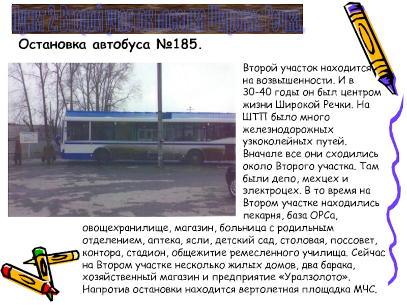 овощехранилище, магазин, больница с родильным отделением, аптека, ясли, детский сад, столовая, поссовет, контора, стадион, общежитие ремесленного училища. Сейчас на Втором участке несколько жилых домов, два барака, хозяйственный магазин и предприятие «Уралзолото». Напротив остановки находится вертолетная площадка МЧС.