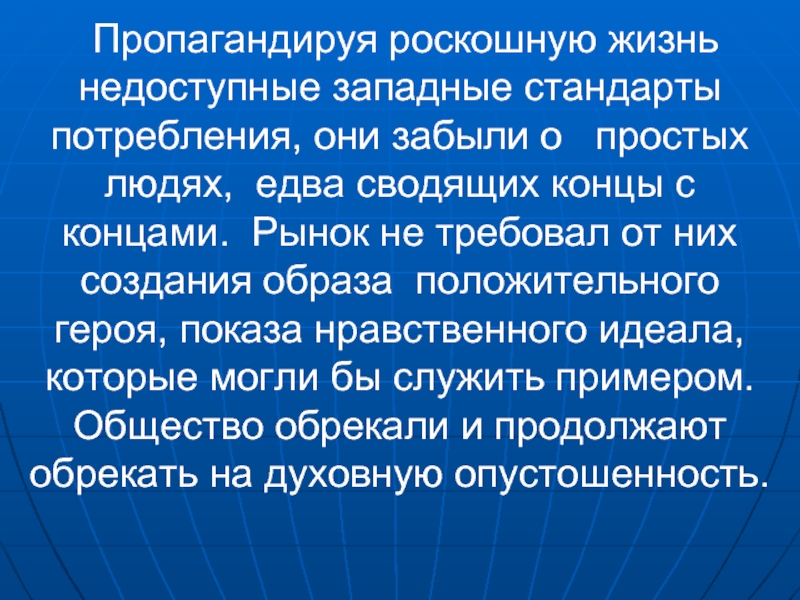 Слайд 38 Пропагандируя роскошную жизнь недоступные западные стандарты потребления, они забыли о