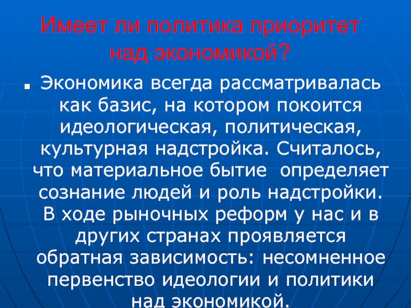 Слайд 4Имеет ли политика приоритет над экономикой?