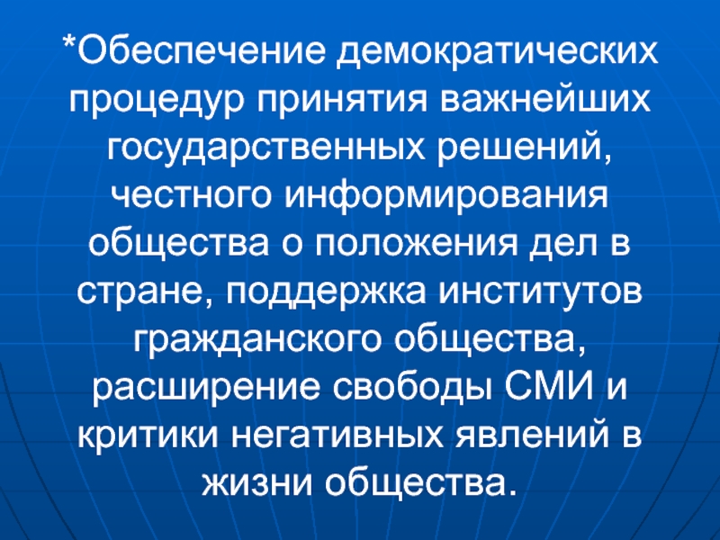 Слайд 17*Обеспечение демократических процедур принятия важнейших государственных решений, честного информирования общества о