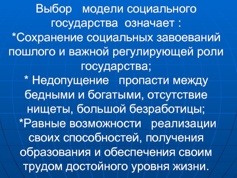 Слайд 42Социальная ориентация экономики, инвестиции в человека, соблюдение социальной справедливости, сокращение имущественного