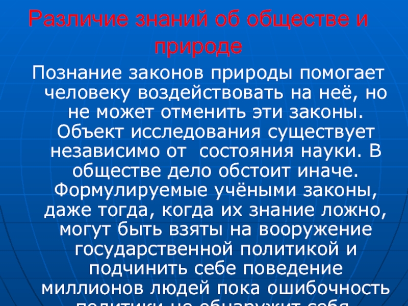 на неё, но не может отменить эти законы. Объект исследования существует независимо от состояния науки. В обществе дело обстоит иначе. Формулируемые учёными законы, даже тогда, когда их знание ложно, могут быть взяты на вооружение государственной политикой и подчинить себе поведение миллионов людей пока ошибочность политики не обнаружит себя.