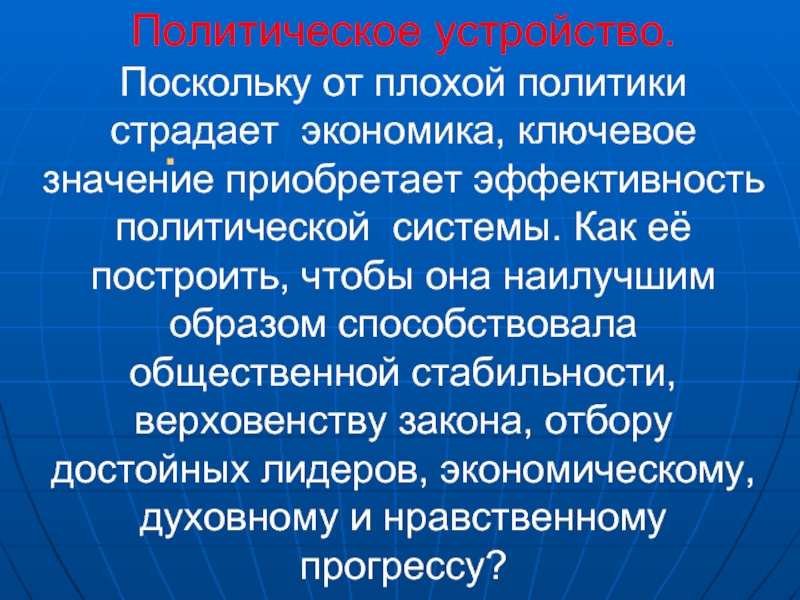 эффективность политической системы. Как её построить, чтобы она наилучшим образом способствовала общественной стабильности, верховенству закона, отбору достойных лидеров, экономическому, духовному и нравственному прогрессу?