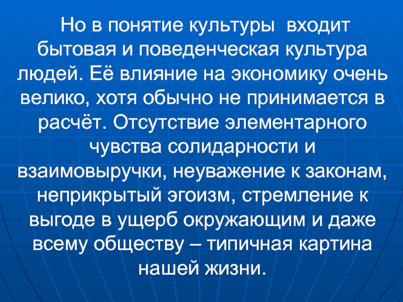 Её влияние на экономику очень велико, хотя обычно не принимается в расчёт. Отсутствие элементарного чувства солидарности и взаимовыручки, неуважение к законам, неприкрытый эгоизм, стремление к выгоде в ущерб окружающим и даже всему обществу – типичная картина нашей жизни.