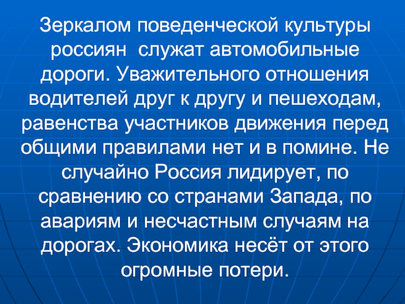 к другу и пешеходам, равенства участников движения перед общими правилами нет и в помине. Не случайно Россия лидирует, по сравнению со странами Запада, по авариям и несчастным случаям на дорогах. Экономика несёт от этого огромные потери.