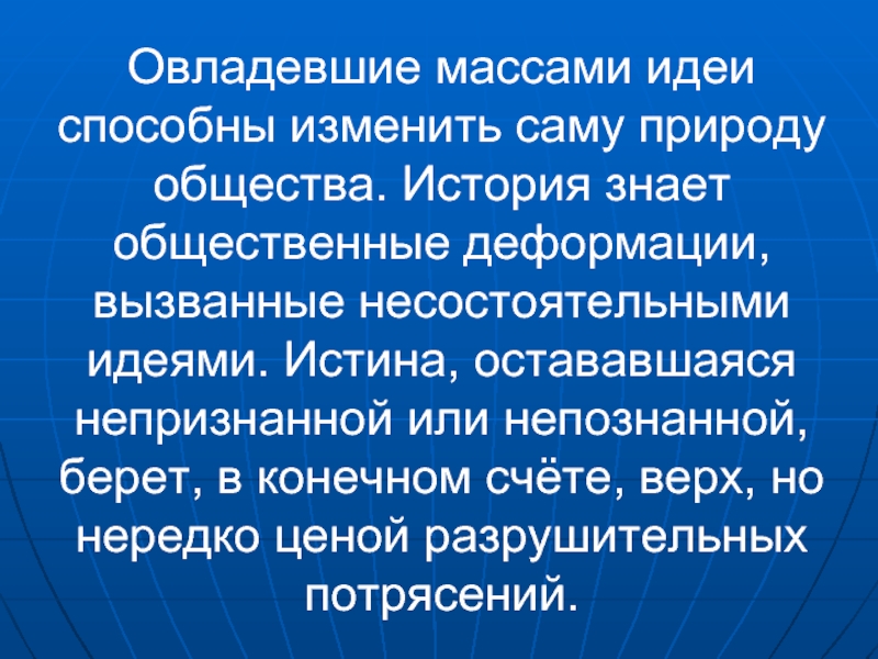 Слайд 9Овладевшие массами идеи способны изменить саму природу общества. История знает общественные