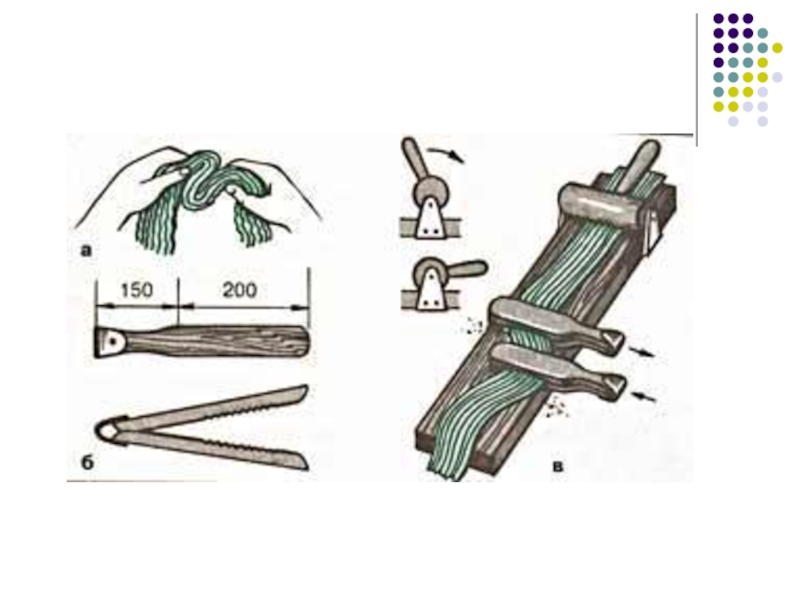 также конопляные мычки состоят из длинных, средних и коротких волокон. Чем длиннее волокна, тем тоньше и длиннее пряжа. Для отделения длинных волокон от средних и коротких в старину использовали большие кленовые гребни, укрепленные на подставках. Но особенно длинные и чистые волокна получали после повторного чесания так называемыми мыкалками - маленькими гребенками и щетками, изготовленными из свиной щетины.