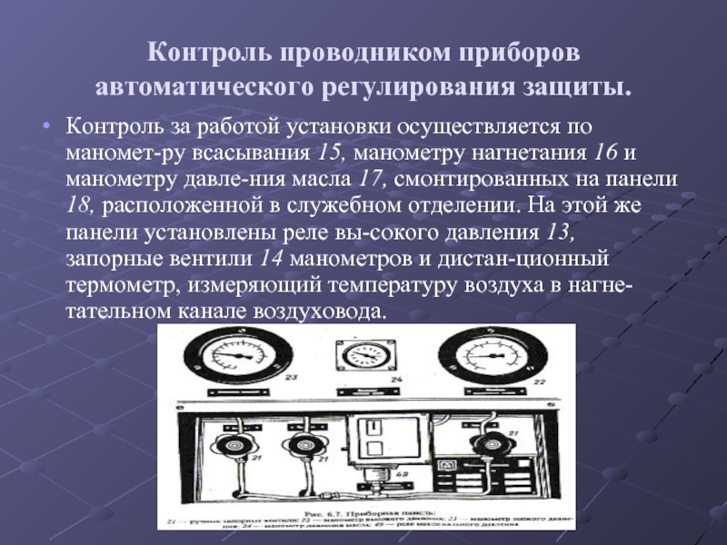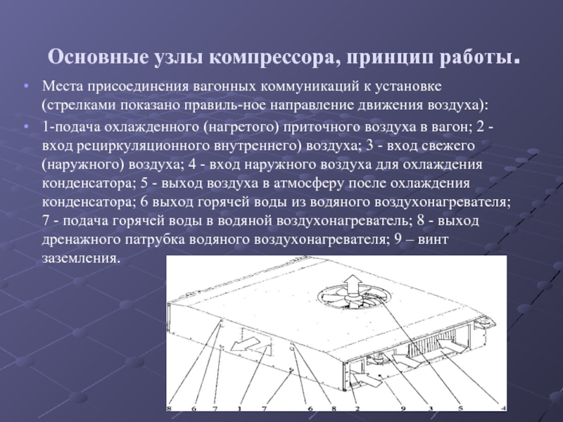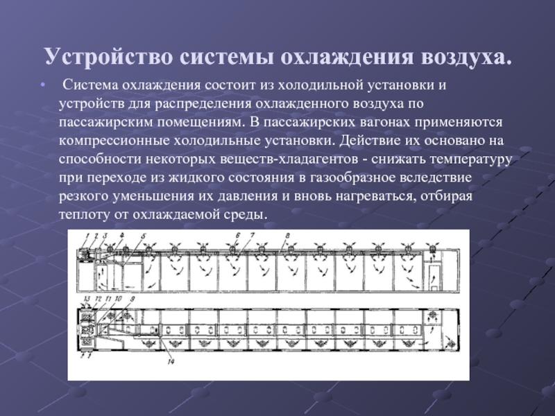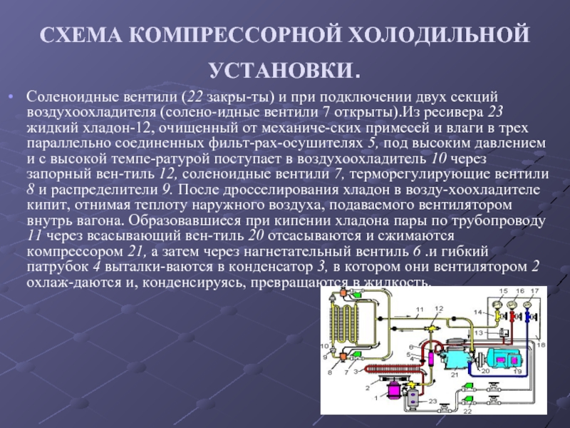 секций воздухоохладителя (соленоидные вентили 7 открыты).Из ресивера 23 жидкий хладон-12, очищенный от механических примесей и влаги в трех параллельно соединенных фильтрах-осушителях 5, под высоким давлением и с высокой температурой поступает в воздухоохладитель 10 через запорный вентиль 12, соленоидные вентили 7, терморегулирующие вентили 8 и распределители 9. После дросселирования хладон в воздухоохладителе кипит, отнимая теплоту наружного воздуха, подаваемого вентилятором внутрь вагона. Образовавшиеся при кипении хладона пары по трубопроводу 11 через всасывающий вентиль 20 отсасываются и сжимаются компрессором 21, а затем через нагнетательный вентиль 6 .и гибкий патрубок 4 выталкиваются в конденсатор 3, в котором они вентилятором 2 охлаждаются и, конденсируясь, превращаются в жидкость.