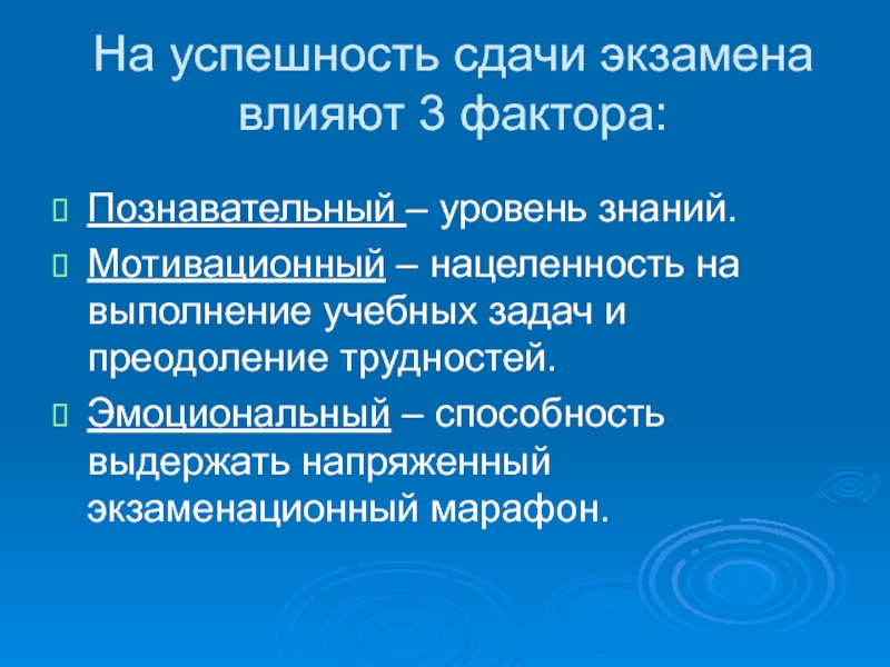Слайд 4На успешность сдачи экзамена влияют 3 фактора: